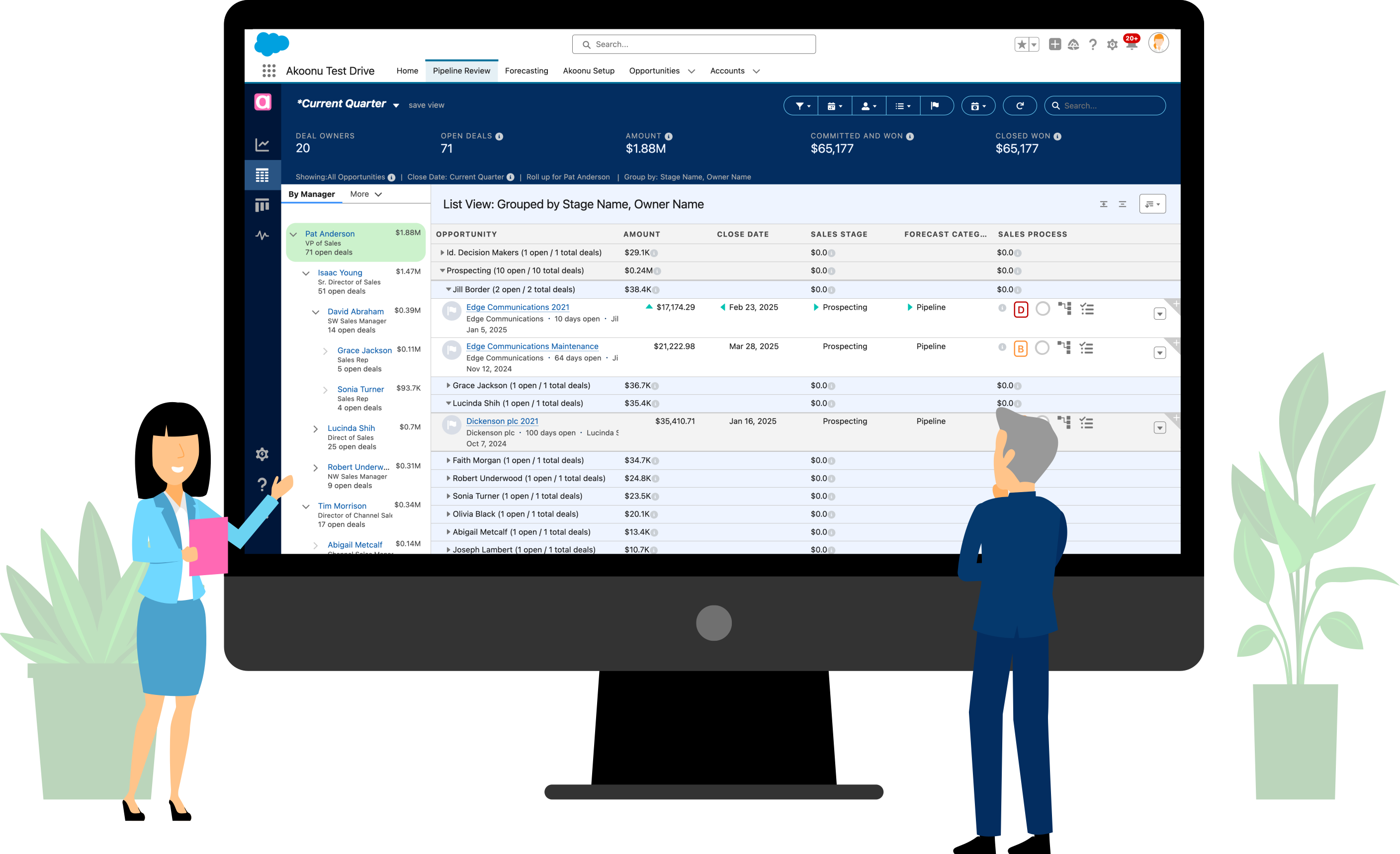 Akoonu for Pipeline Reviews has made our sales team stop complaining about going through a weekly pipeline review process. Everything they care about is available at their fingertips, and real insight as to how their individual and team's pipeline is performing is available immediately.