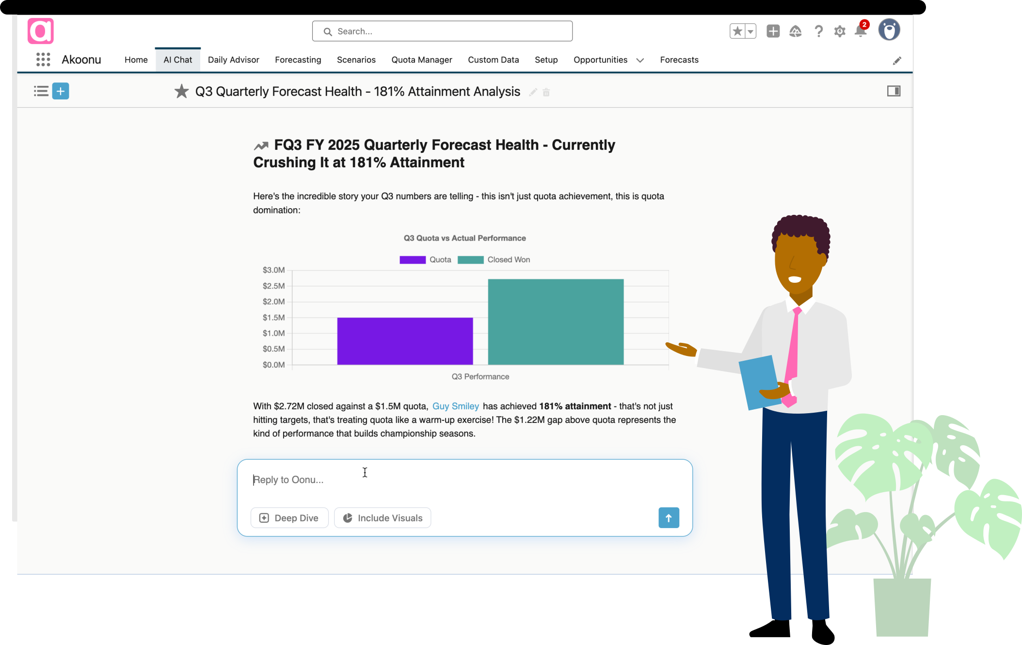 Your tireless partner that never sleeps, never gets overwhelmed, and always has the answer. We call ours Oonu—what will you name yours? Ask sales questions in plain language—watch your agent dig through pipeline data, investigate opportunities, and analyze forecasts to expose what matters and deliver crystal-clear insights. Start with intelligent templates—from quick status checks to deal deep-dives to multi-year trend analysis—then explore deeper through conversation. What used to require reports, dashboards, data teams, and endless patience now happens in moments.